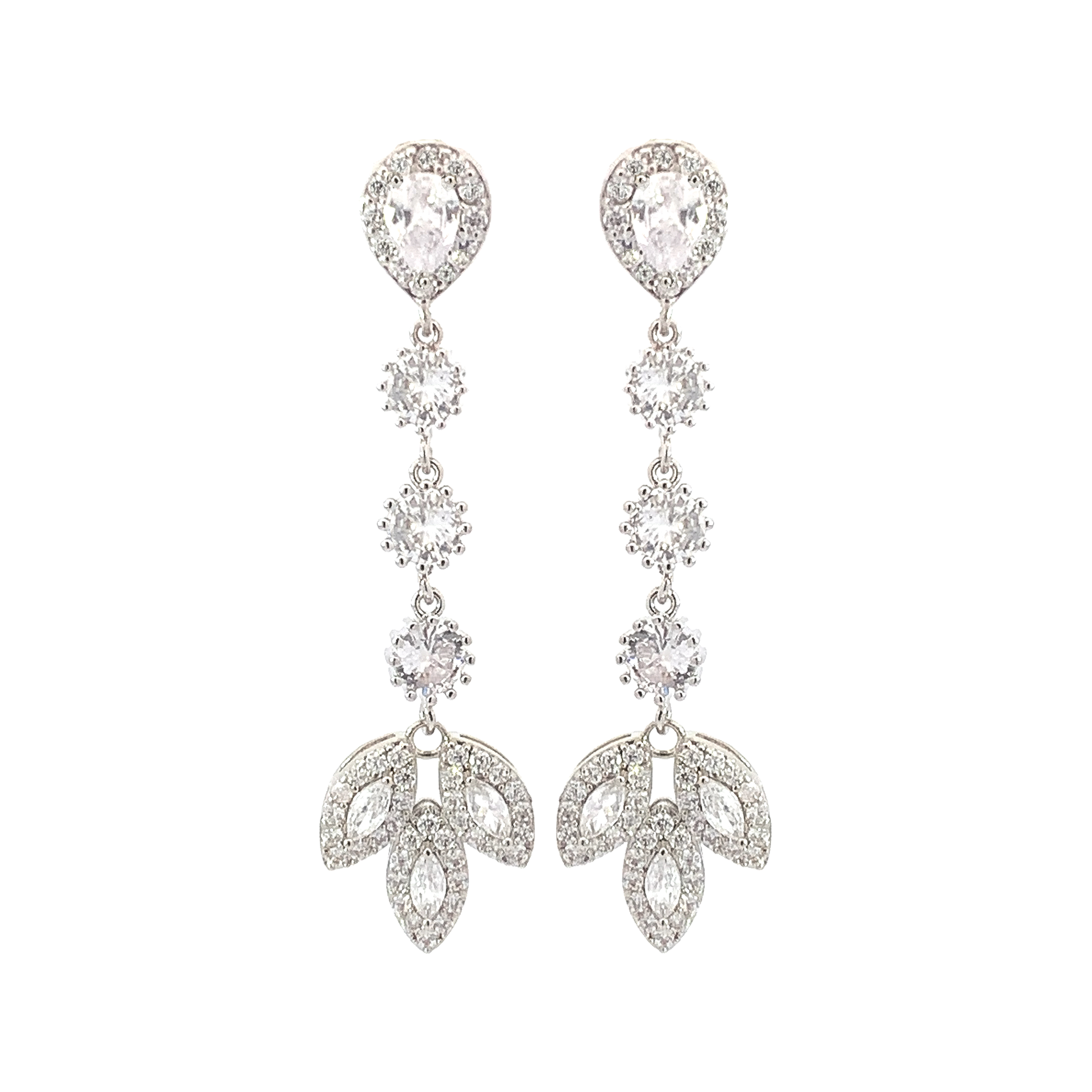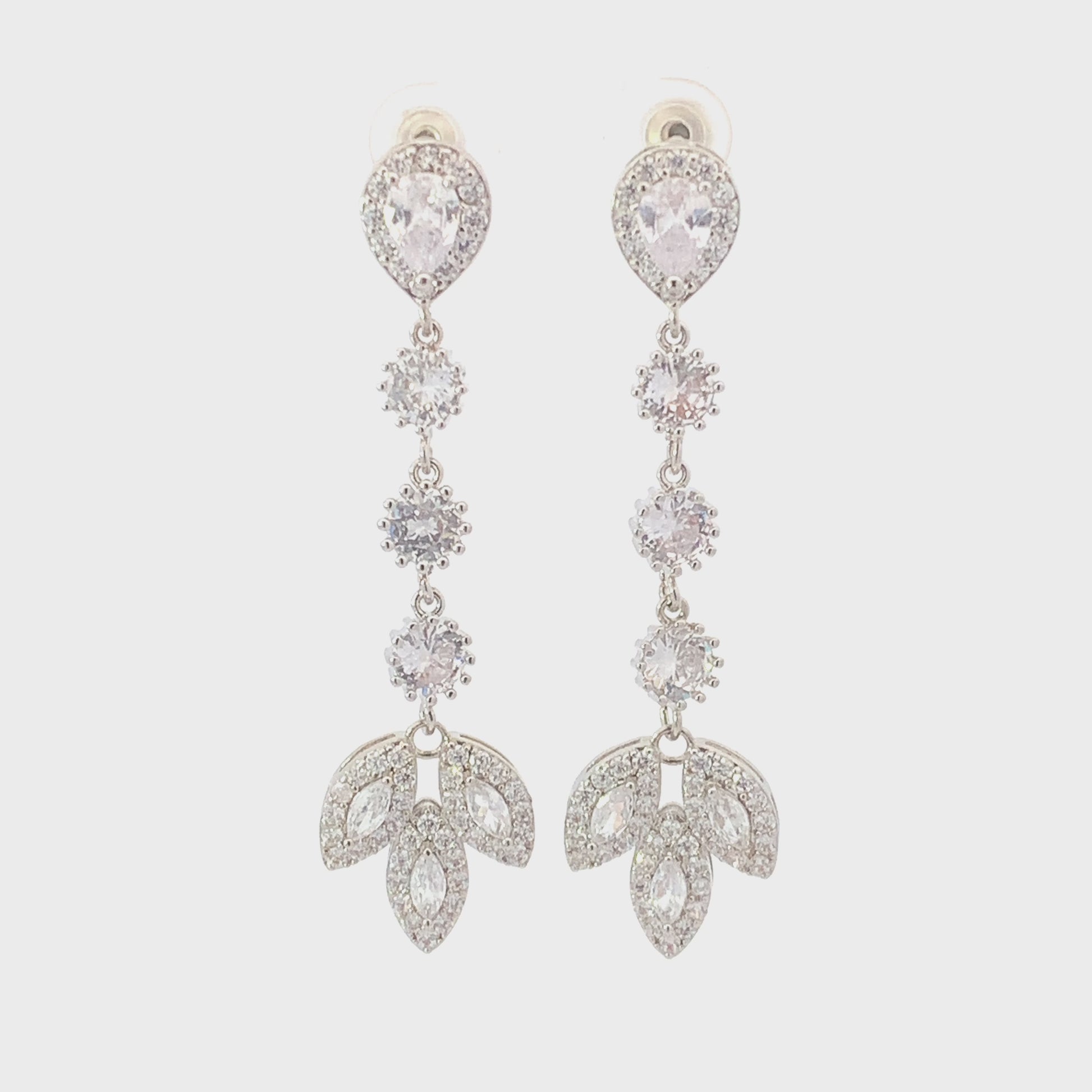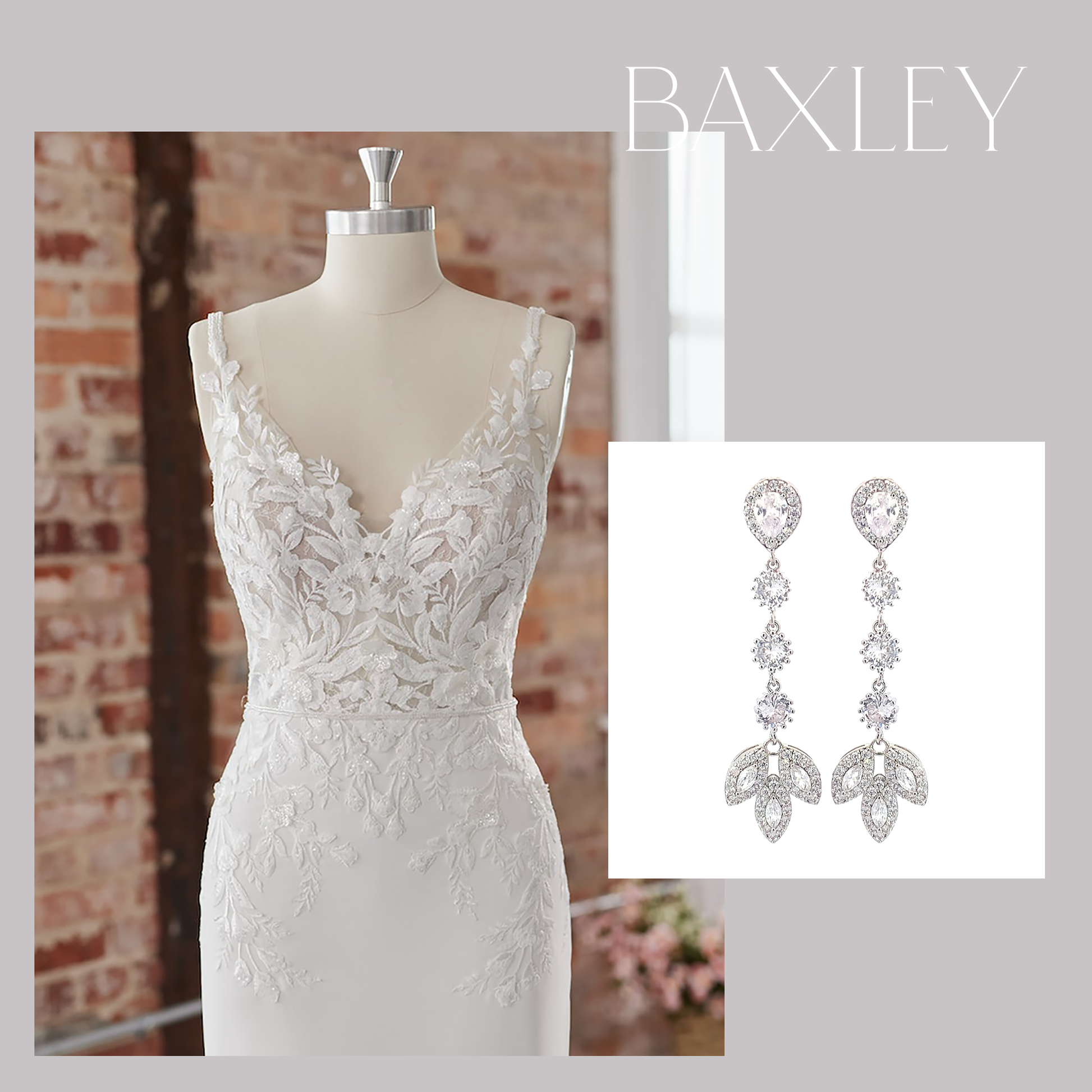 We designed our Baxley earrings to coordinate with Maggie Sottero's Baxley bridal gown. We think a long, shimmering pair of earrings is the perfect accessory to go with the dress, and we incorporated a leaf motif to coordinate with the lace design.
