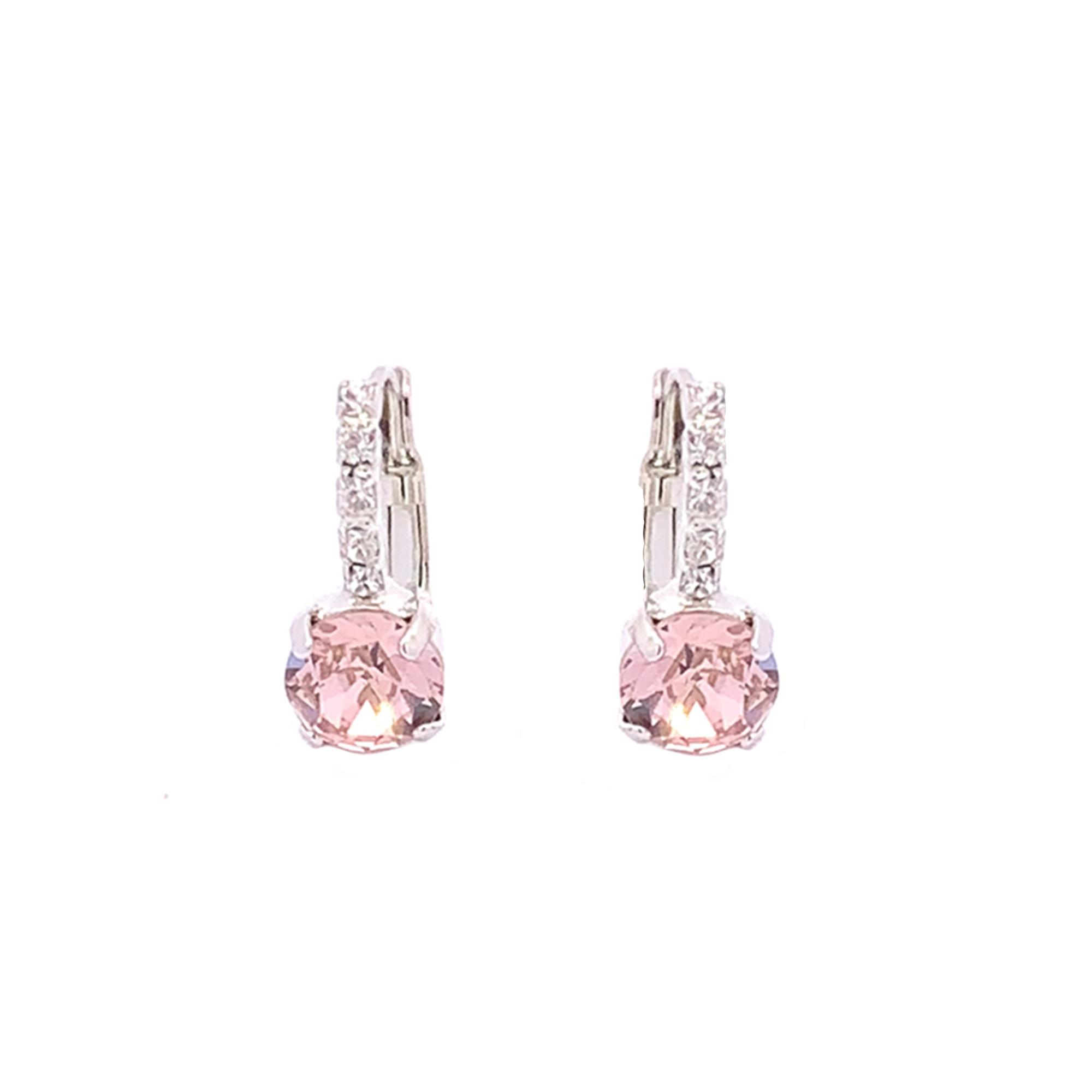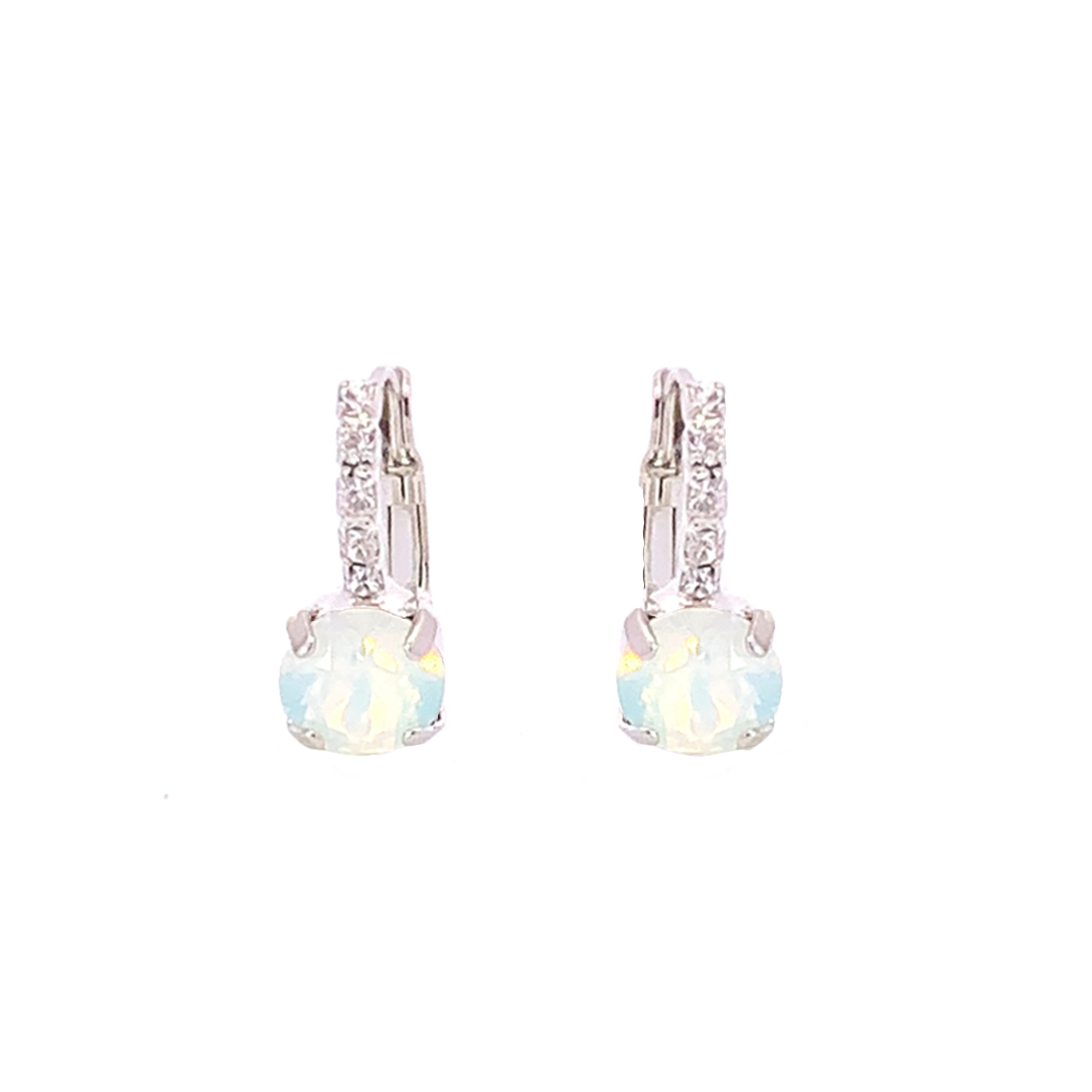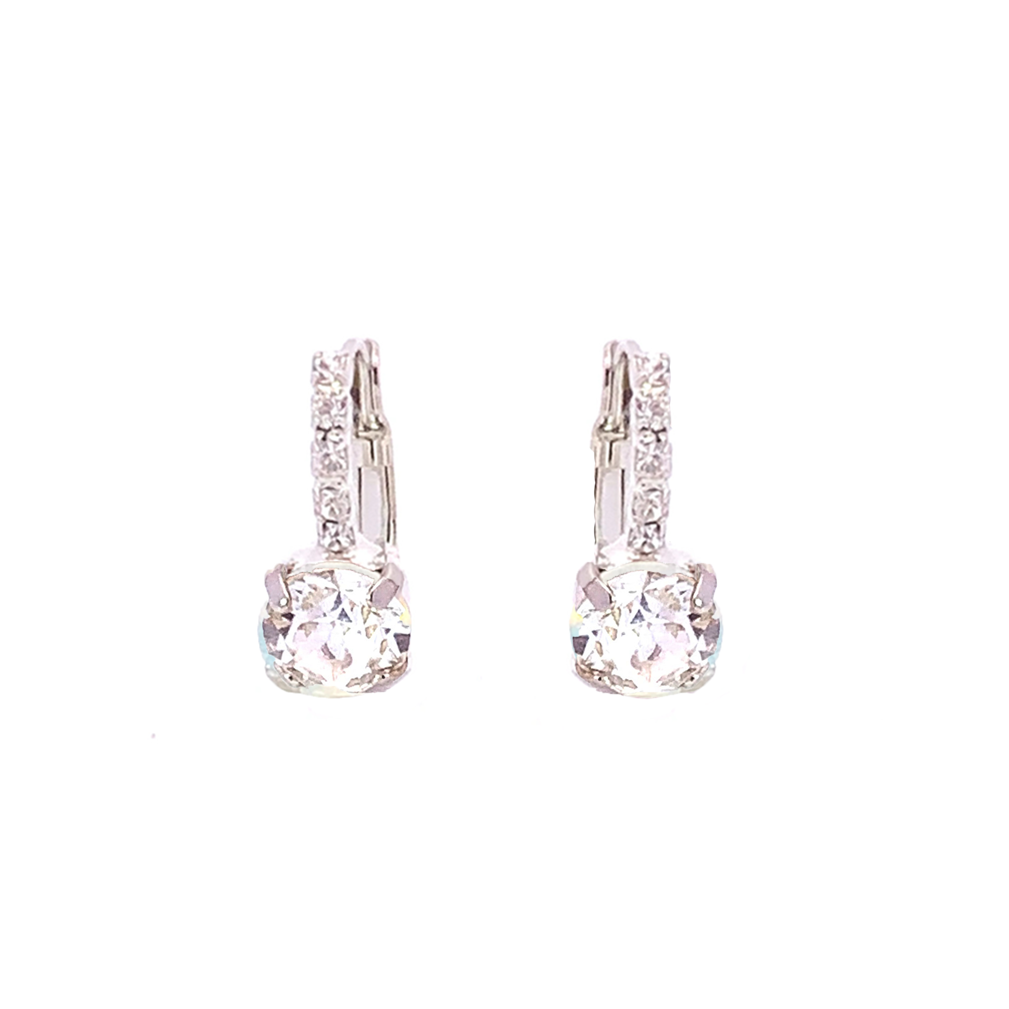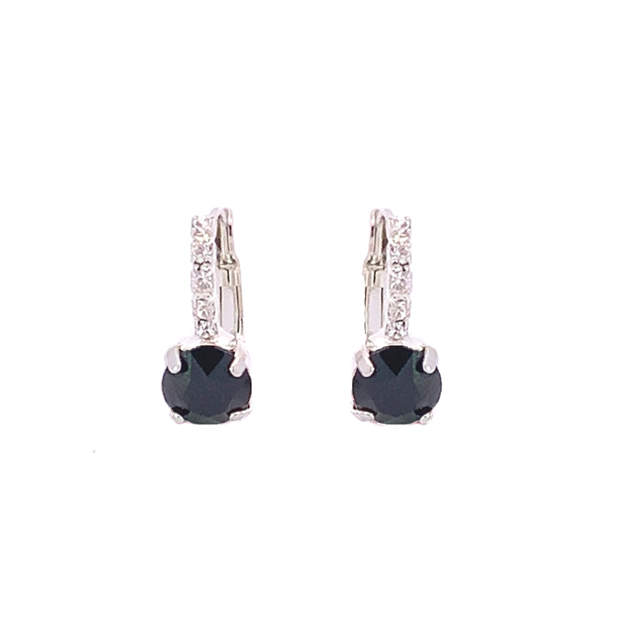 The perfect black finishing touch, these earrings are made of tiny pavé set clear crystal stones on a lever back post, with an 8mm round (2 carat) stone. Elegant, chic, and oh so pretty!